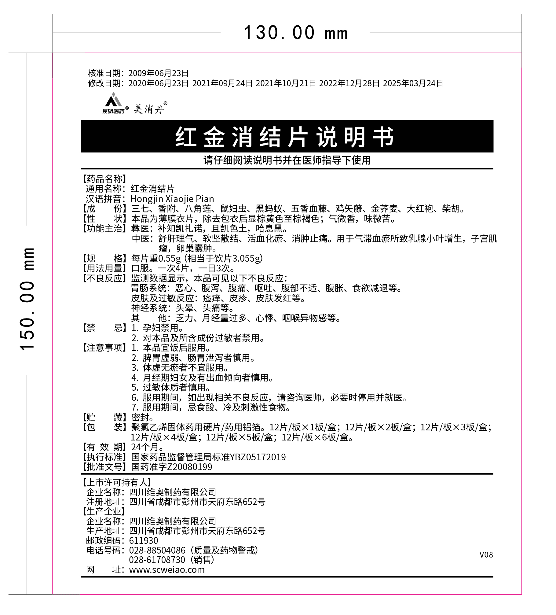 我司對(duì)紅金消結(jié)片說明書(批準(zhǔn)文號(hào):國藥準(zhǔn)字Z20080199)進(jìn)行修訂